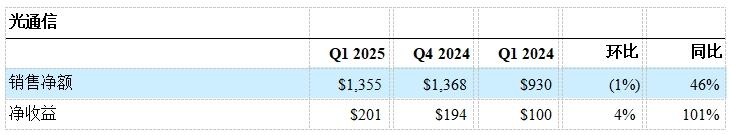 光通信第一季度销售额为13.6亿美元,同比增长46%,主要得益于康宁在企业业务中新型生成式人工智能(Gen AI)产品的持续强劲应用,企业业务销售额同比增长106%。第一季度净收益为 2.01 亿美元,同比增长 101%,主要得益于销量提升带来的强劲利润增长。