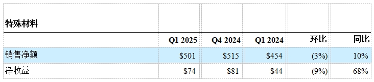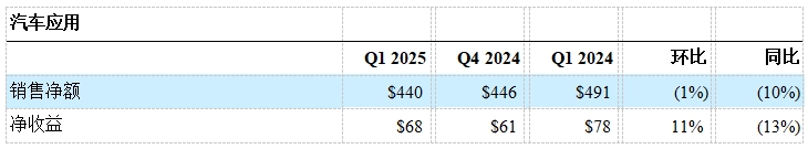 汽车应用第一季度销售额为4.4亿美元,净收益6,800万美元,均与上一季度持平,主要反映了欧洲和北美轻型和重型车市场的持续疲软。自2025年1月1日起,公司将汽车玻璃解决方案业务从 Hemlock 与新兴发展业务中剥离出来,与环境科技业务一起归入新成立的汽车应用集团管理。为便于比较,对既往期间的业绩进行了相应调整。