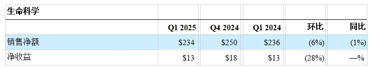 生命科学第一季度销售额为2.34亿美元,同比下降1%。净收益为1,300万美元。