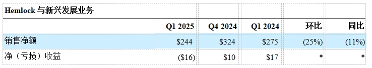 Hemlock与新兴发展业务第一季度的销售额为2.44亿美元,反映了正常的季节性。自2025年1月1日起,公司将汽车玻璃解决方案业务从Hemlock与新兴发展业务中剥离出来,与环境科技业务一起归入新成立的汽车应用集团管理。为便于比较,对既往期间的业绩进行了相应调整。