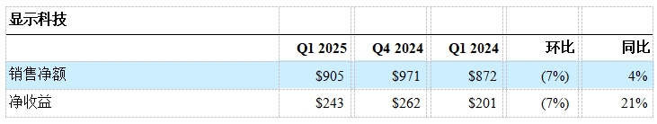 显示科技第一季度销售额为 9.05 亿美元,同比增长 4%,源自销量和价格的增长。净收益为 2.43 亿美元。自第一季度起,公司将(美元兑)日元的恒定汇率由107元调整为120元,与其更新的对冲汇率保持一致。上一财年的数据维持107元(恒定汇率)不变。