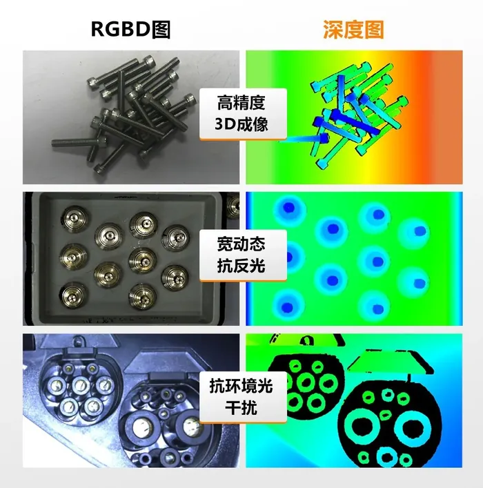 通过高性能处理芯片,宽动态光学设计,结合自动曝光、多帧融合等多种算法处理,有效应对金属表面高反光问题,同时具备优异的抗环境光性能,在小尺寸螺钉、高反光金属、汽车充电口等各类复杂场景下成像优异。