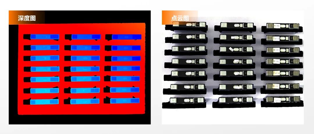 Ultra系列激光振镜立体相机可配合关节机器人,应用于汽车、机加工、锂电等行业中对复杂工件、结构件、不规则零部件等物体进行高精度定位抓取。在一些特定场景下,既需要大视野,也需要高精度。以电芯上下料为例,多层泡沫托盘中码放的电芯对定位精度要求较高,部分窄电芯仅有12mm薄,Ultra系列产品依然可以呈现细腻完整的点云成像。