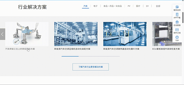 【行业解决方案】板块基于对客户需求的深度洞察,采用“行业×产品×工艺”的展示逻辑,覆盖汽车、电子、食品/药品/化妆品、PV、医疗、新能源等重点领域。方案内容深度融合产品信息,一步到位满足需求。