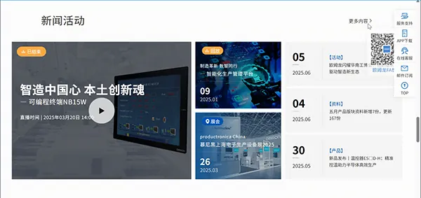 全新三分屏动态主视觉,聚焦欧姆龙核心产品线,轮播推荐最新产品、重要活动及精选方案。重要资讯即时触达,核心价值一眼聚焦。