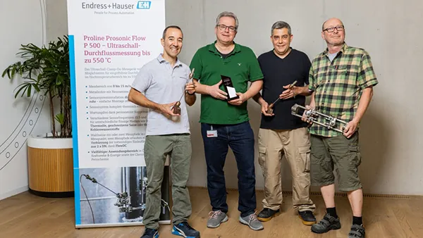 Endress+Hauser流量位于瑞士赖纳赫的产品开发团队从来自全球的27个竞争对手中脱颖而出。团队由Beat Kissling、Quirin Müller、Roberto Vitali和Andreas Berger四人组成,共同开发出Endress+Hauser首款可耐受550℃高温的非侵入式捆绑式超声波流量计传感器。