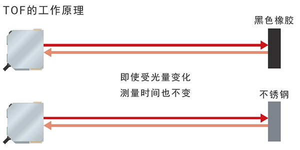 TOF方法通过时间差测量距离,受工件的颜色和材料影响较小。此外,由于受光量对TOF的影响也不大,因此即使是黑色橡胶等低反射率工件,也能实现远距离检测。