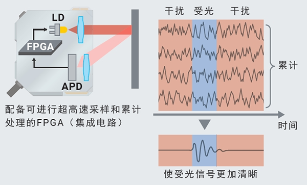 对通过每秒100亿次的超高速采样获得的约1000万项数据进行累计处理,使受光波形更加清晰,并将干扰降至更低,从而稳定检测微弱的光。