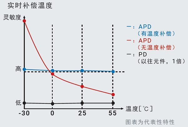 配备可检测出微小受光量的高灵敏度APD*2。利用传感器内部的温度元件实时补偿温度,可抑制温度导致的特性变动,实现稳定检测
