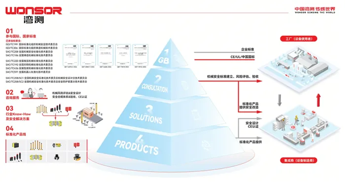 作为国内工业安全领域唯一同时具备ISO专家、国际机械安全专家及国标委专家团队的企业,湾测始终将标准制定与产业需求紧密结合,构建了“标准制定-安全咨询-场景化解决方案-标准化产品”的闭环能力,并将标准要求贯穿于安全技术研发体系之中。