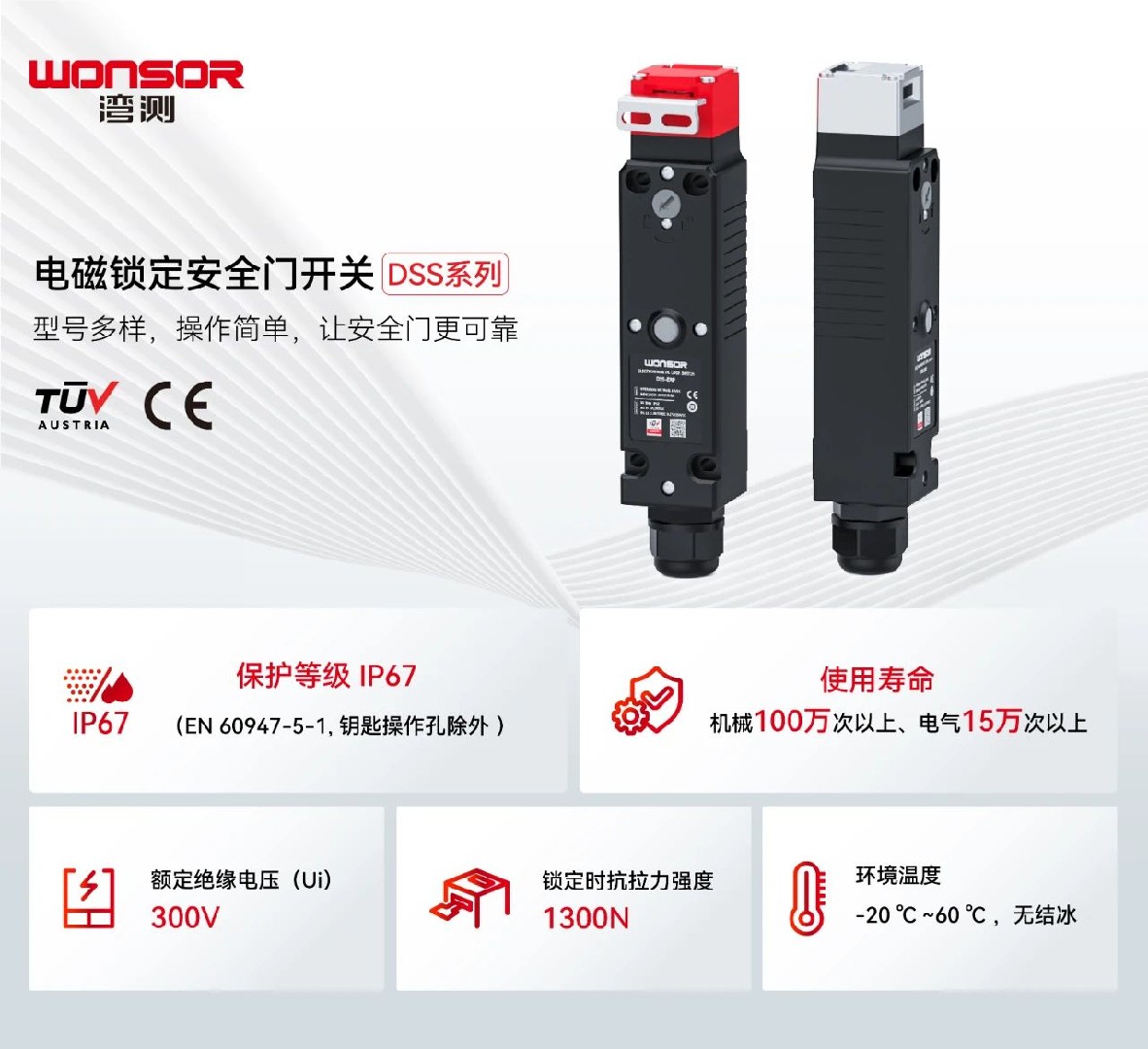 EN 60947-5-1(基础安全要求)、ISO 14119(防篡改设计)和ISO 13849-1(机械安全性能)等标准,确保在复杂工业环境中的可靠性和安全性,为制造商提供统一的技术基准。以湾测安全门开关DSS示例,其设计与制造均严格遵循上述国际标准,成为工业安全领域可靠性与合规性的双重标杆。