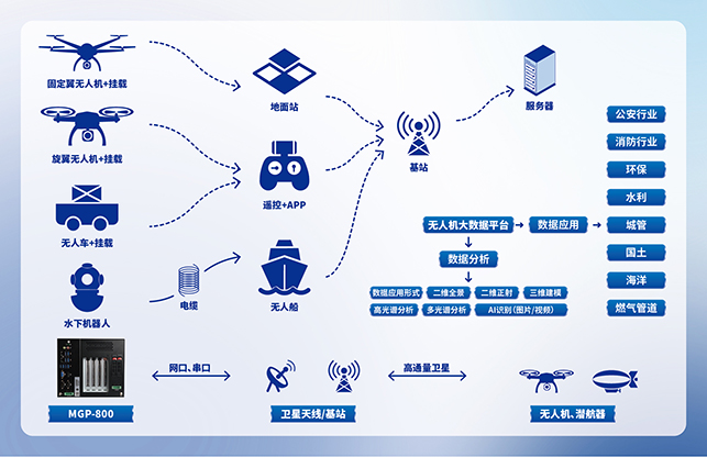 该系统集成了飞行姿态控制、多航线规划(含复飞)、自动返航、多模网络(4G/5G/WiFi)传输、直播推流及航拍图片拼接等完备功能,依托MGP-800的高性能与高可靠性,确保无人机作业安全、灵活且智能高效。