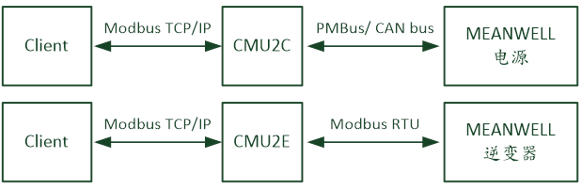 明纬智能控制器:CMU2C、CMU2E等皆导入Modbus TCP/IP作为对外链接的通讯手段。换个方式而言,客户不需要花时间了解如何控制电源,而只需要专心整合系统即可,电源之间相关的通讯则留给电源的专家——明纬,帮忙处理即可。有关各控制器的详细使用说明,请参考其使用手册。