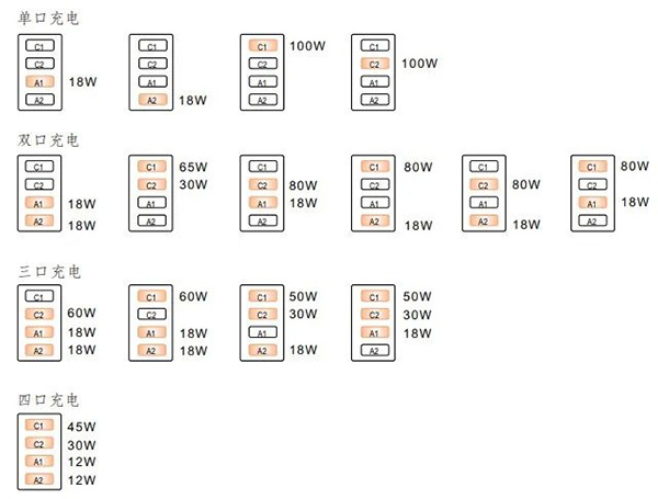 支持 PD(Power Delivery) 3.0 和 QC (Quick Charge)2.0、3.0 等主流快充协议,可满足包括笔记本电脑、平板计算机、智能手机等多种设备的高效充电需求。下图详细说明了不同数量接口充电时各接口支持的最大功率: