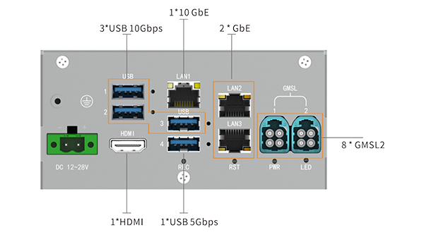 8路GMSL接口支持星型/链式拓扑连接,可根据机器人形态灵活布局摄像头。例如,服务机器人可在顶部、底部、侧面分别部署广角镜头、深度相机与避障镜头,GMSL接口通过轻量化布线实现“即插即用”,相比传统方案大幅减少布线复杂度,为机器人小型化设计释放空间。