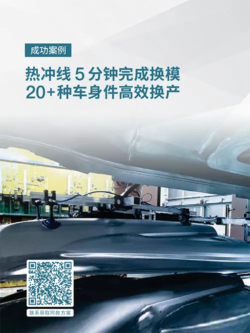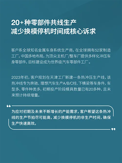 2023年初,客户规划在天津工厂新建热冲压 线,专为奔驰、理想汽车生产A/B/C柱、下横梁等车身件,初期投产阶段即面临20+种车身零部件共线生产,减少换模 停机的非生产时间,提高生产节拍,充分释放产能成其核心诉求。