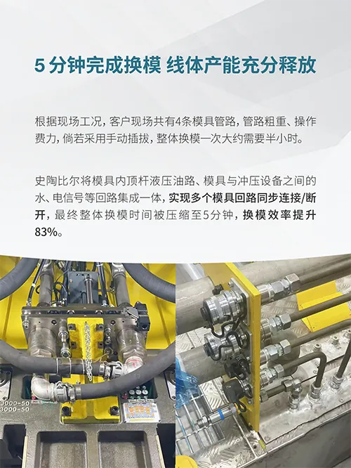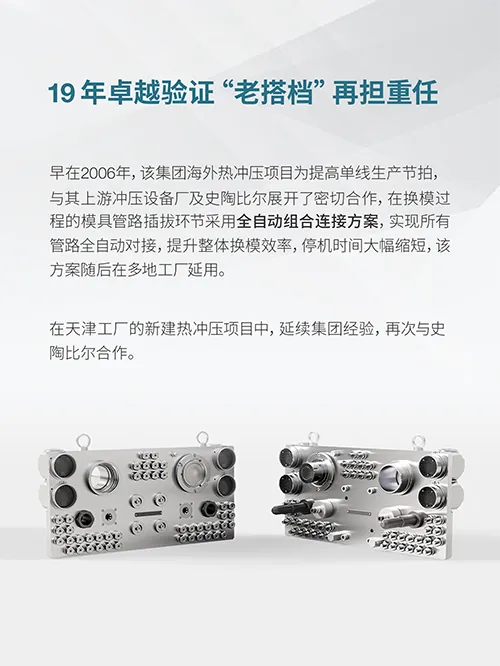 延续与该集团在其全球热冲压 快速换模 项目上的多年合作经验,史陶比尔根据天津工厂现场工况,定制设计全自动组合连接 方案,实现多个#模具 回路同步连接/断开,最终整体换模时间压缩至5分钟,换模效率提升83%,停机时间大幅缩短,助力线体产能充分释放。