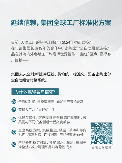 在与该集团长达19年的合作中,史陶比尔全自动组合连接产品在其海内外各地工厂均发挥优异性能,赢得客户信赖——集团未来全球新建冲压线,将均统一标准化,配备史陶比尔全自动组合对接系统。