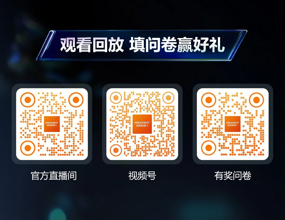 本场发布会的回放可通过海康机器人官方直播间、视频号观看,扫码填写需求问卷更有机会获得多种实用好礼。