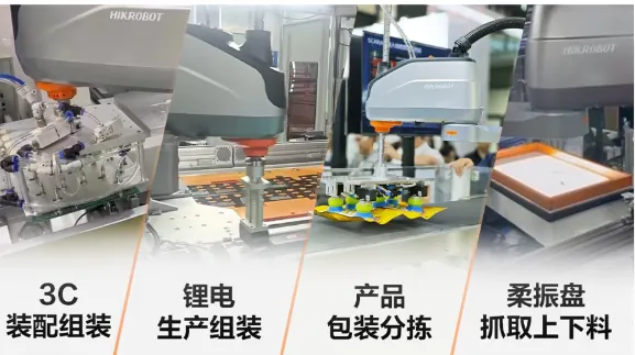 依托完善的产品矩阵与核心技术优势,海康机器人SCARA产品系列在3C装配/组装、锂电生产组装、产品包装分拣、柔振盘抓取上下料等多行业场景中持续发力,实现广泛落地。
