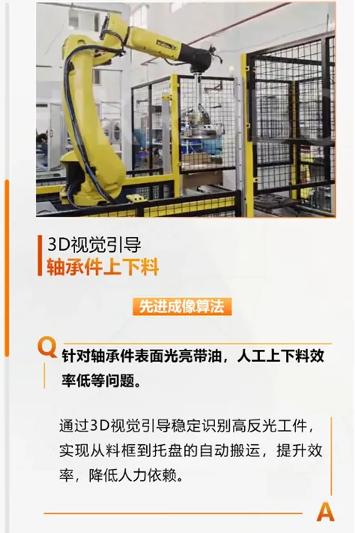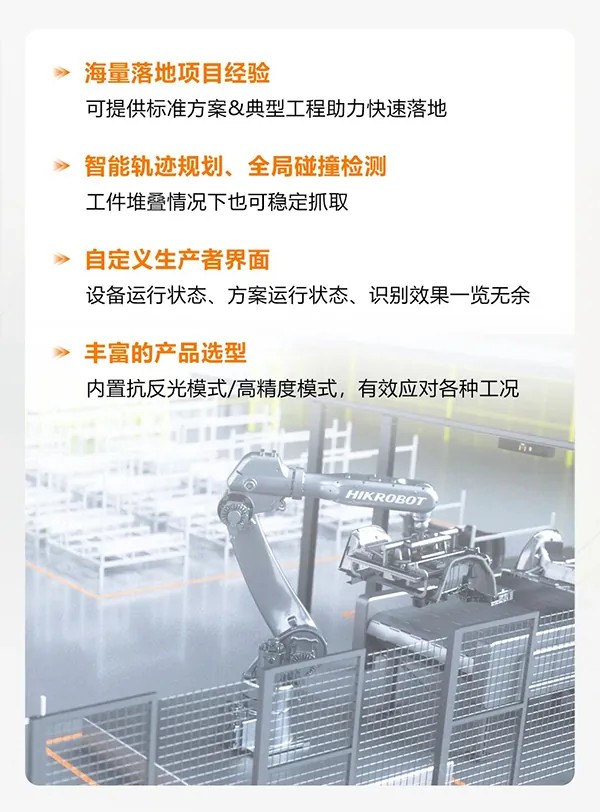 海康机器人3D视觉引导系统,采用双目结构光立体相机,结合自研RP机器人引导平台,提供柔性自动化上下料解决方案。