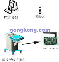 通过1个 GW21SW-MAXI 模块集成在医疗无线手推车上,可RS232/RS485/RS422连接医疗串口设备,再通过WLAN无线网络与与 PC 服务器连接。WLAN不会影响心脏起搏器等敏感器件,从而提供即时信息查询和临床数据记录;并且整合了新型无线通讯技术为医疗服务。利用无线局域网桥接技术,可以解决网络铺设时遇到不可破坏或不可穿越的公共设施等问题。