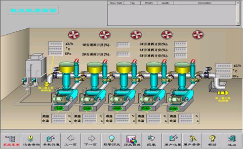 在鼓风机房,系统需要控制鼓风机组的开关机顺序,检测鼓风机组的故障报警,根据生化池中溶氧的浓度调节出风阀开启度,检测生化池等相关仪表的参数。在脱水机房系统需要采集脱水机房、污泥池内电气设备运行工况及附近的仪表参数并对相应电气设备进行控。在变电所需要采集鼓风机房高压变配电所设备的运行工况及对附近电气设备进行控制等。具有现场设备查询,故障记录及报警,各项数据曲线等功能。