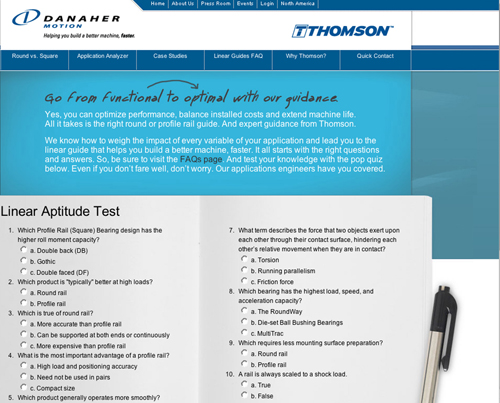 2007年9月26日——全球领先的运动控制解决方案提供商丹纳赫传动(Danaher Motion)公司针对直线导轨推出子网站,该网站不仅帮助用户对直线导轨进行功能选择,还可帮助他们为特定应用选择最合适的导轨。用户访问该网站的用户可通过线性能力测验(Linear Aptitude Test)了解圆形轨和方形轨技术和相关解决方案,通过问答部分解答疑惑,还可通过功能强大的Application Analyzer应用分析工具为特定选择应用解决方案。