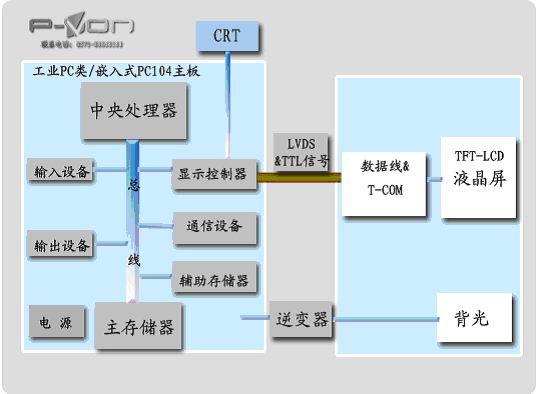 所谓工业PC/嵌入式PC104主板搭配方案主要指通过内嵌CPU及显示控制功能的IPC(工业主板)或ARM直接控制液晶屏实现显示。如原理框图3-1.