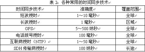 目前有多种时间同步技术,每一种技术都各有特点,不同技术的时间同步精度也存在较大的差异,如表2所示: