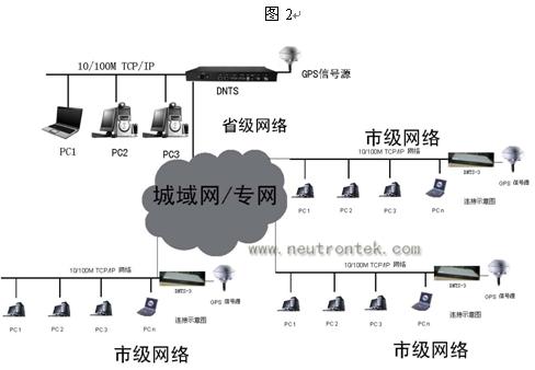 在上面的方案中,从省中心网络到各地市级网络需要保持应用界面的时间同步。如果仅仅在省级网络中设立一台网络时间服务器那么地市级网络中的客户端由于网络延时等原因不能保证所需精度,那么通过在地市级网络中也设立网络时间服务器就能解决这一问题,因为这种情况下各地的GPS接收机在接收到3颗以上卫星信号时大家的时间源都是当前的标准时间,所以时间源的一致性得到保证。同时,即便某地的GPS接收机发生故障这是本地的网络时间服务器可作为NTP的客户端向上一级省中心网络的一级时间服务器请求标准时间继续提供精准的时间源为本地网络的客户端提供校准服务。在极端情况下,当省级网络中设立的一级时间服务器GPS也发生故障时,一级时间服务器具备高精准的自守时功能(守时精度1×10 -12即30年误差1s)仍然能提供精准的时间源。方案中的一级时间服务器采用中新创科DNTS-6型,二级时间服务器采用DNTS-3型。