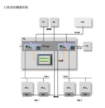 站台上每一列门都是由PSC和贝加莱2003控制和监视的。DCU和 PCC通过CAN总线联网,传输速度为100KBits。这对于定时要求是足够的。CAN总线能在最长180米的站台范围内以相同的速度传输。PSC从门搜集数据,并将之传输到SMS(站台管理系统)。另外,在控制室使用贝加莱Power Panel系列的PP120,门及其功能等重要信息均在其上有所显示,并且时间报告被传输到本地环境监控系统中进行进一步分析。