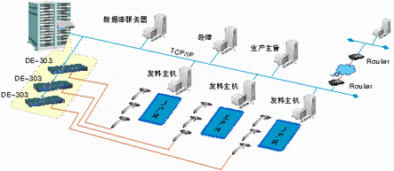 本案例中,使用Windows 2000 作为主机操作系统平台,配备MOXA DE-303串口设备联网服务器,DE-303与条码枪连接,以RS-232通讯方式采集数据,DE-303网口连接到局域网,将数据送到各发料主机串口及相关部门,从而实现生产自动化管理。Moxa串口设备联网服务器DE-303,每台带有16个RS-232串口,可连接16个条码枪,根据条码枪的位置不同,用户可灵活地就近安装,主机与DE-303之间连接采用已有的工厂局域网,最大限度地利用了网络的优势,节约成本和降低布线费用,并提升效率,使生产现场的信息可以实时传送到每一个需要信息的计算机上。