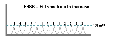 跳频扩频技术 (Frequency-Hopping Spread Spectrum; FHSS)在同步、且同时的情况下,接受两端以特定型式的窄频载波来传送讯号,对于一个非特定的接受器,FHSS所产生的跳动讯号对它而言,也只算是脉冲噪声。FHSS所展开的讯号可依特别设计来规避噪声或One-to-Many的非重复的频道,并且这些跳频讯号必须遵守FCC的要求,使用75个以上的跳频讯号、且跳频至下一个频率的最大时间间隔(Dwell Time)为400ms。