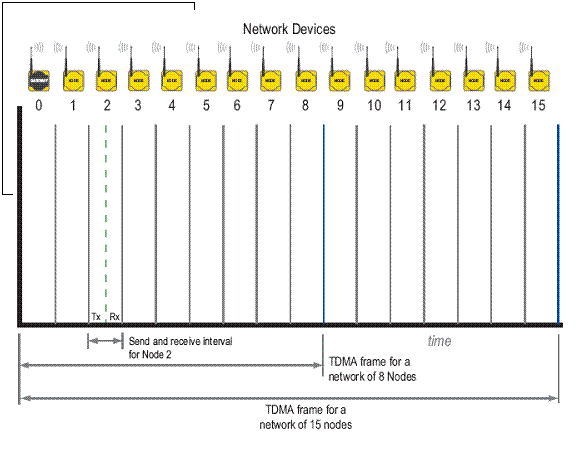 如前所述,TDMA系统形成频率时间矩阵,在每一频率上产生多个时隙,这个矩阵中的每一点都是一个信道,在基站控制分配下,可为任意一个节点提供与网关的TxRx通讯。