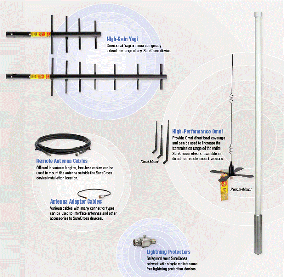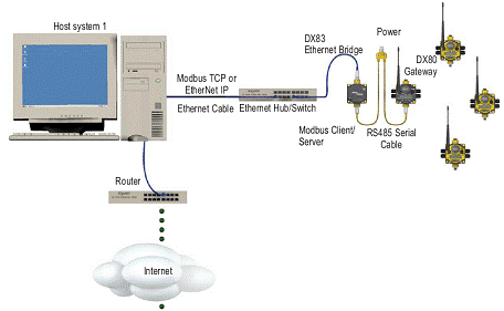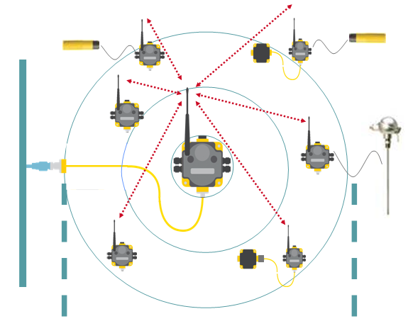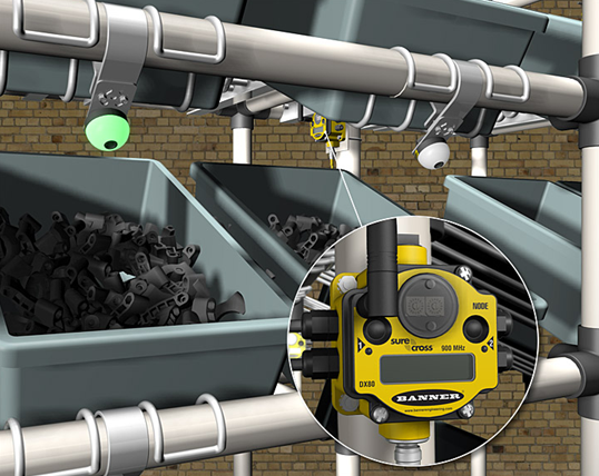 Banner 公司DX70无线传感器能将现场的各种传感器信号如: 开关量,模拟量及热电阻,电偶. 通过节点I/O无线传输到网关(节点与网关为双向通讯), 网关通过RS485 MODBUS,ETHERNET IP, TCP/IP MODBUS传输到PLC以及上位机. 传输距离一对一约为1.5Km左右, 在星型拓扑连接架构下, 2.4GHz型号最远可达3.2Km.