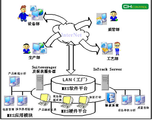 由下图可见,工厂内部各管理部门可以通过局域网对InTrack Server进行交互操作,依靠 MES 系统提供的数据形成一个紧密合作的整体,做到实时信息共享和协作处理,业务流程变得有序而高效。