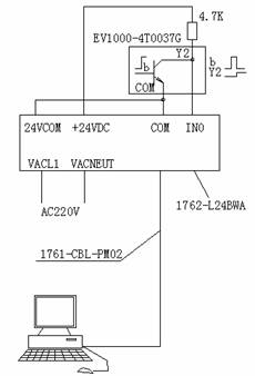 本文以AB公司1762-L24BWA 为例介绍应用方法。接线见图1:Y2通过4.7K电阻接到外部24VDC电源,脉冲信号从IN0-COM输入到PLC,幅值为24V。