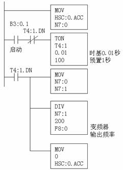 频率计算的方法是:计数器HSC:0在1秒时间内累计进入IN0的脉冲数目,除200后所得结果F8:0即为变频器输出频率。在正常计数时,PLC 端口IN0的 LED灯会快速闪动。测量误差取决于EV1000参数F7.32和计时器T4:1的时基。本例,最大误差为±0.5Hz.
