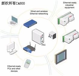 在图1的工厂实例中,PAC、操作员和办公室工作站、测试设备、生产线和过程传感器和执行元件及条形码阅读器都安装在遍布厂房的标准10/100 Mbps 以太网内。在某些情况下,设备没有内置网络的链接,比如温度传感器,都连到位于中间的Ethernet-激发的I/O单元的I/O模块上,依次与PAC通讯。