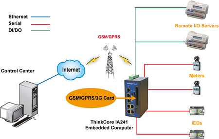 Automatic Meter Reading (AMR)自动抄表系统是电力市场的一个重要应用,因为它能让其更自动。使用无线通讯,AMR能够实现远距离传输和低成本管理以及低费用。 电力行业的一个客户在AMR系统中采用Moxa的 IA241 嵌入式计算机作为前置控制器。IA241提供多种串口连接选项,可以连接电表,传感器和其它IED,收集的信息很方便通过蜂窝网络(GSM/GPRS)传输到远端控制中心。内置的双网口用于提供一个到控制中心的有线连接,保证持续性操作和网络冗余。4个D/DO通道可以连接一些DIO的设备,例如Moxa的remote I/O server。此外,IA241可以通过内置的Moxa Protocol Converter软件来管理不同协议间的通讯,从而降低了系统集成和开发的成本。
