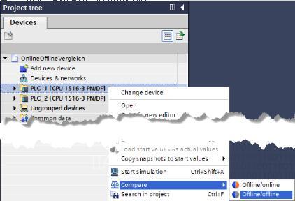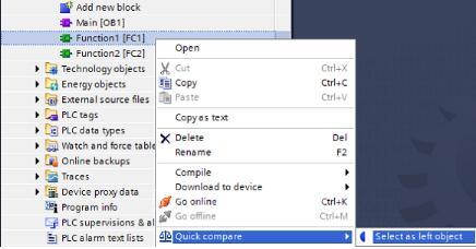 使用 TIA V14 SP1 或更高版本的软件时,可以直接在同一项目的项目树中执行两个块之间的“快速比较”。右键点击程序块选择 “ 快速比较 > 选择为左侧对象 ”。