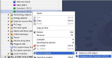 右键点击第二个程序块选择 “ 快速比较 > 与 ' Function1[FC1] ' 进行比较 ”。