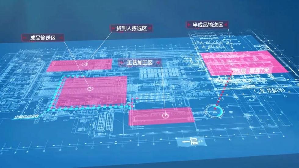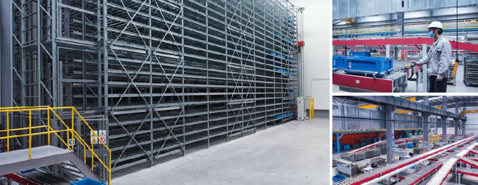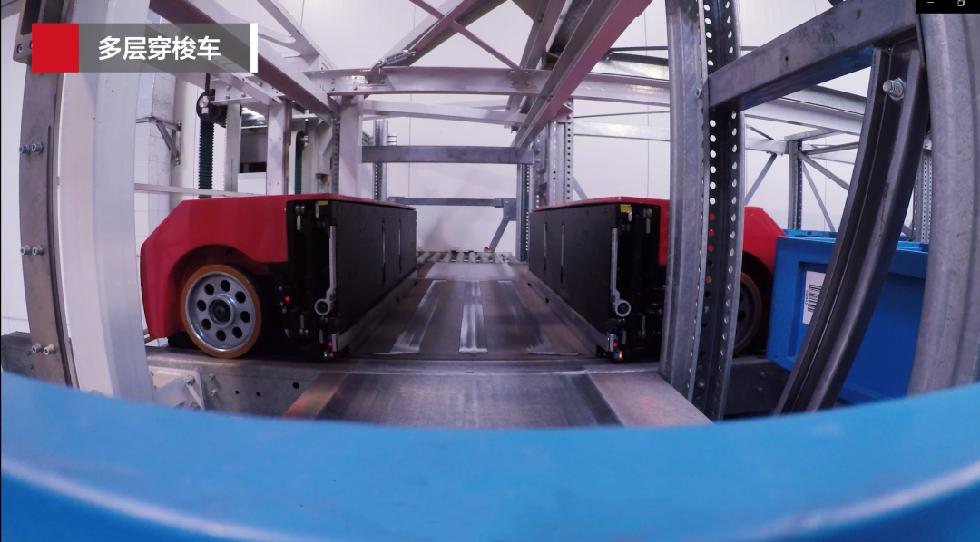 ▲ 双层料箱输送系统,实现制芯-组芯-浸涂-烘干-下芯全生产流程物料自动化输送,全产线货到人设计