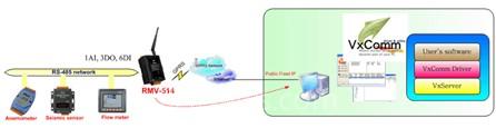 RMV-514是一款工业用智能型多串口系列带I/O的GPRS网关,他可以将连接RS-485的设备通过GPRS传输资料并监控I/O状态。RMV-514采用泓格独特的VxComm技术,配合安装VxServer软件于远程计算机,即可在远程计算机上虚拟出RMV-514上相对应的串口,使RMV-514上的串行端口就如同使用计算机上的串行端口一样简单,使用者也可以使用Modbus命令通过远程的Virtual COM Port去监控RMV-514的I/O状态,借由RMV-514优化核心功能,可提供任何串行设备远程监控应用。