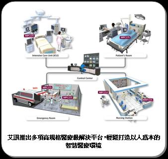 艾讯从就诊者角度及满足医院的具体需求出发,设计开发一系列医疗级平板计算机系统,具备高稳定性、超静音、超薄轻盈、防水防尘设计等优势,并通过 UL60601-1/EN60601-1、CE 及 FCC Class B 认证;应用产品包括:院所导览机、护理站电视墙、病患挂号系统、医疗讯息发布平台、专业级护理车、Point-of-Care (定点照护) 等各式产品。适合应用于:医疗院所内公共空间、诊间、护理站、住院病房、照护设备、医疗中心、急诊救护车等连结成完整一系列的智慧医疗系统。