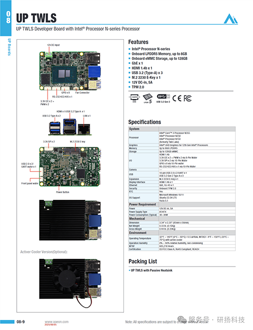 两款开发板均提供Intel® Core™ 3处理器N355、Intel® Processor N250或N150三种CPU选项,这些采用最新Intel低功耗能效技术的处理器。但从电路板设计可以看出,二者针对不同部署环境进行了专门优化:研扬科技通过将I/O与CPU布局在同一平面,将UP TWLS的厚度压缩至仅25.13毫米。在能效比方面表现依旧卓越。优化的电路设计使其能灵活适应各类部署环境,同时支持-20°C至70°C的宽温工作范围,特别适合工厂等严苛工业场景。