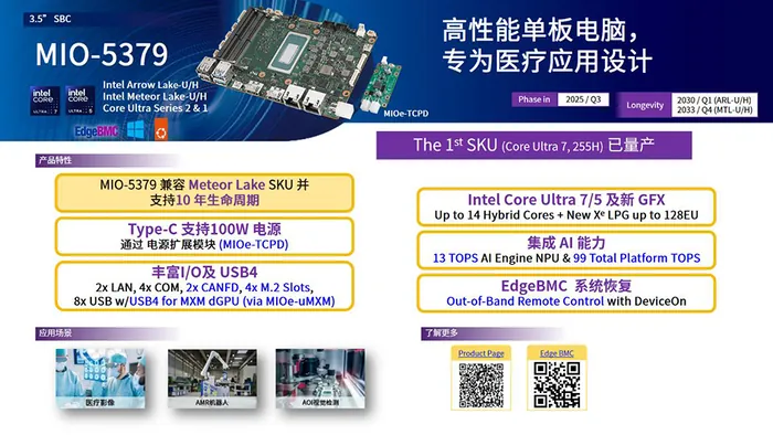 为了加快边缘AI开发,配备垂直领域专用软件堆栈的独立显卡在解决方案迭代中发挥着重要作用。然而,这些通常需要配备标准PCIe扩展卡的全尺寸主板,从而导致系统占用空间较大,不适合紧凑型或移动医疗设备。另一方面,较小尺寸的主板往往缺少支持外部AI加速器所需的高速接口,在空间受限的医疗场景中难以承载进阶AI工作负载。此外,医疗设备通常需要同时执行多项任务,例如图像采集、实时分析、数据后处理、AI推理和多屏显示等,导致系统架构复杂,布线密集。这种复杂性不仅增加了部署难度,更增加了临床环境中操作错误的风险。