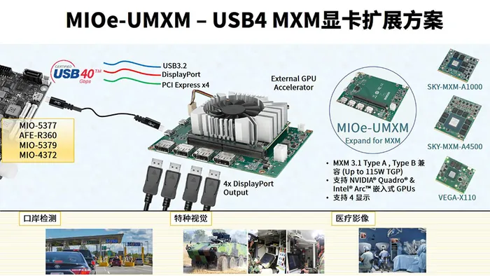 研华MIO-5379嵌入式单板采用 USB4 技术,可通过USB、DisplayPort 及 PCI Express Gen.3 x4 实现高速传输,通过单根电缆提供高达40 Gb/s的带宽。这种高度集成的高性能接口使开发者能在维持强大AI算力的同时压缩系统体积。当搭配MIOe-UMXM扩展模块的USB4接口时,MIO-5379可在紧凑空间内支持外接GPU与AI加速卡,无需重新设计整机架构。这种基于线缆的柔性扩展方案显著提升配置灵活性,特别适合紧凑型AI医疗内窥镜设备。