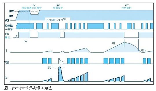 pv-ipm是三菱电机开发的专用于太阳能光伏领域的智能功率模块,将igbt及其驱动电路、保护电路集成在同一模块内。pv-ipm采用三菱最新的cstbttm硅片技术,将饱和压降vce(sat)和关断损耗的折衷关系最优化,并实现了噪声di/dt的降低。在内部集成了新的控制ic,可使开关频率高达30khz。内部集成了欠压、短路和过温三种保护功能,无论检测到哪种故障时,ipm都将输出一个故障信号,使内部igbt单元关断,从而使器件免遭损坏。欠压保护值uv约为12v,复位值uvr为12.5v;短路的电流保护阈值sc约为2倍模块额定电流;过温保护的阈值ot为135℃,复位值otr为125℃。整个保护动作示意图如图1所示。